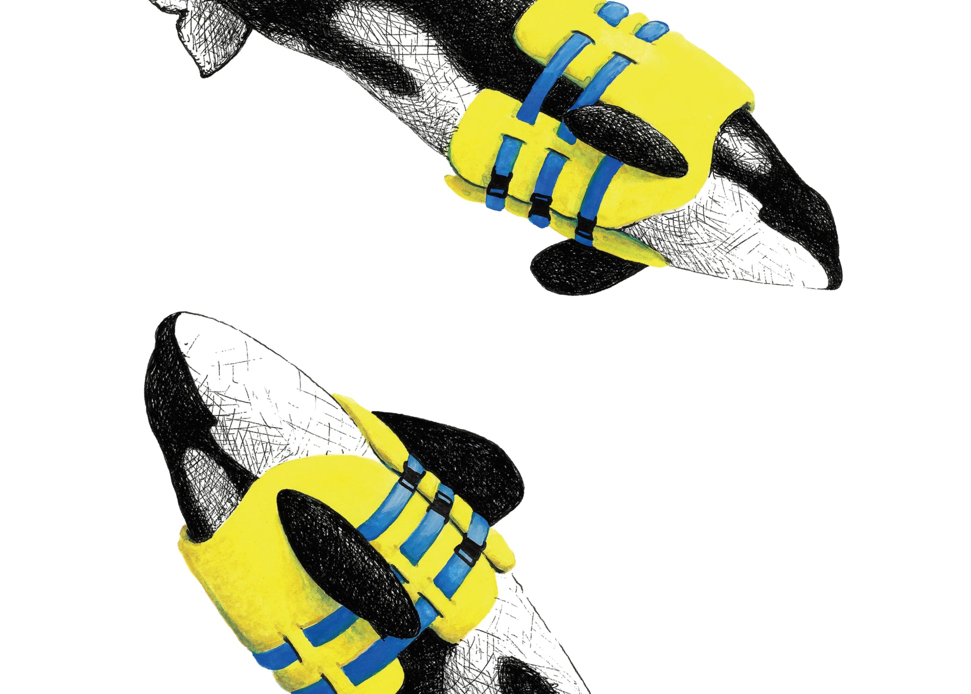 Life Preserver Orcas features a male and female orca enjoying a swim with a helpful boost. This cheerful image combines whimsy with traditional zoological drawing techniques. The original, hand-drawn design was created with ink and watercolour.
