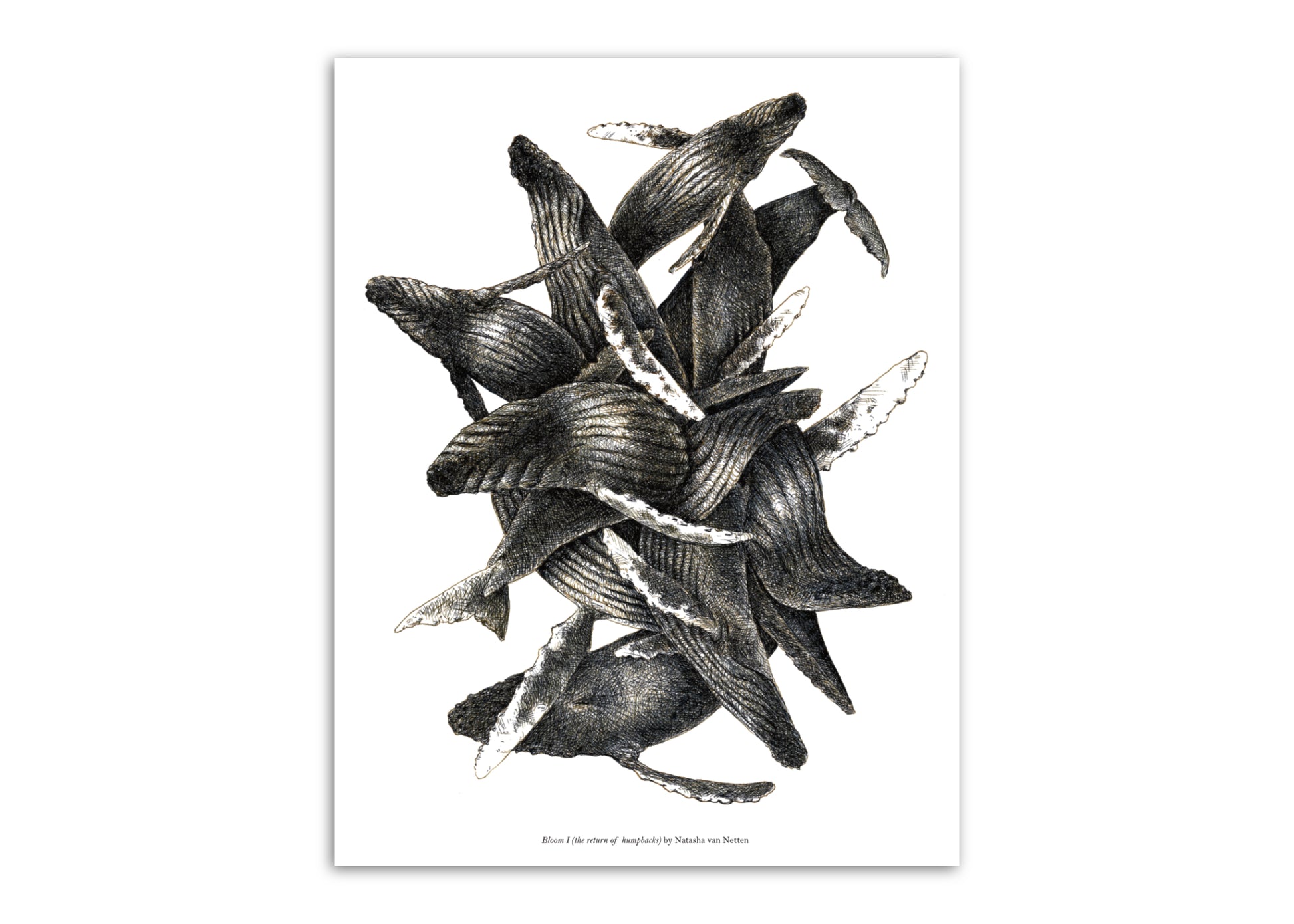 This print, called Bloom I, features a swarm of humpback whales drawn as though they are bursting forward. The original drawing was created using black and brown ink and a dip pen. It was inspired by traditional zoological illustrations, but created with a contemporary spin. The artwork focuses on the recent growth of the humpback population within the Pacific Northwest.