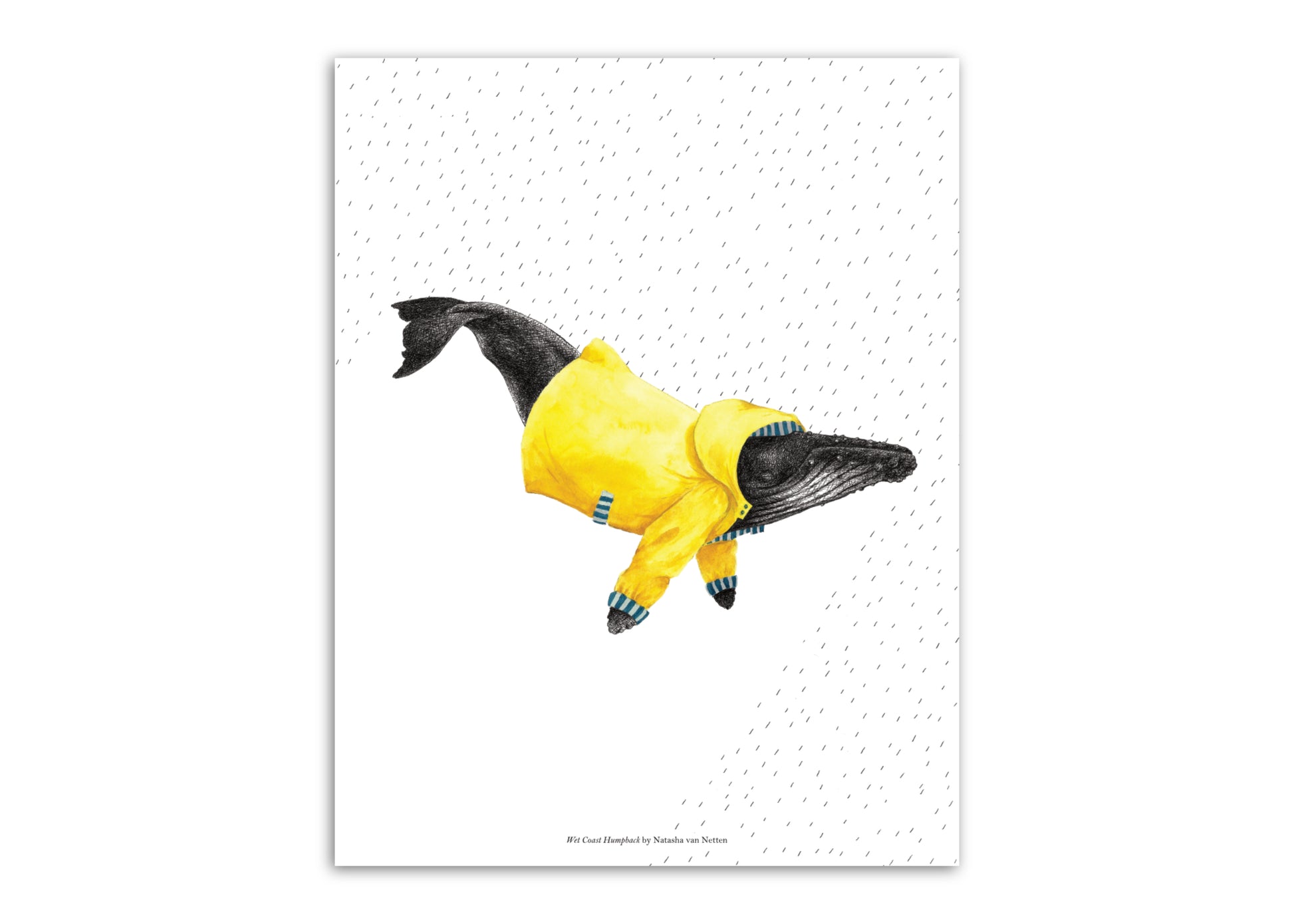 Wet Coast Humpback print: Rainy weather is common on the coast... and this whale knows how to dress for it! This unique poster print card features a humpback wearing its favourite yellow rain jacket. This design was originally hand-drawn with ink and watercolour.