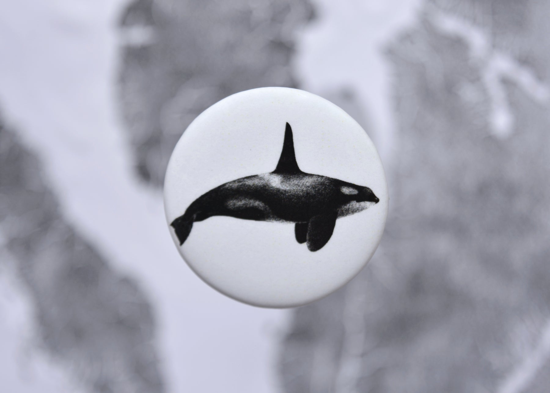 This playful button features a southern resident killer whale. A great way to add a little flair to your favourite jacket, apron or bag. The original design was drawn by hand using pen and ink.