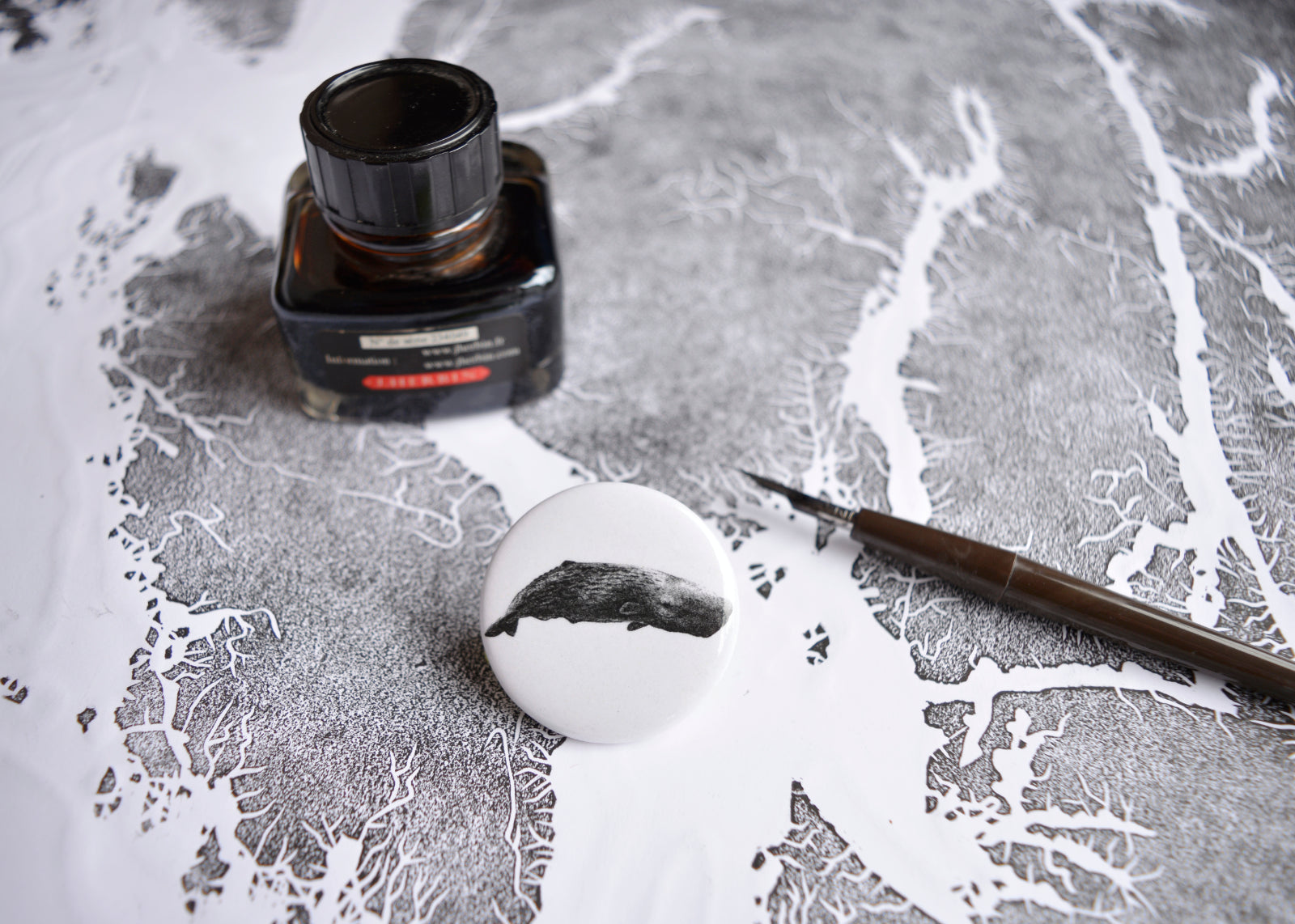 This playful button features a sperm whale. A great way to add a little flair to your favourite jacket, apron or bag. The original design was drawn by hand using pen and ink.