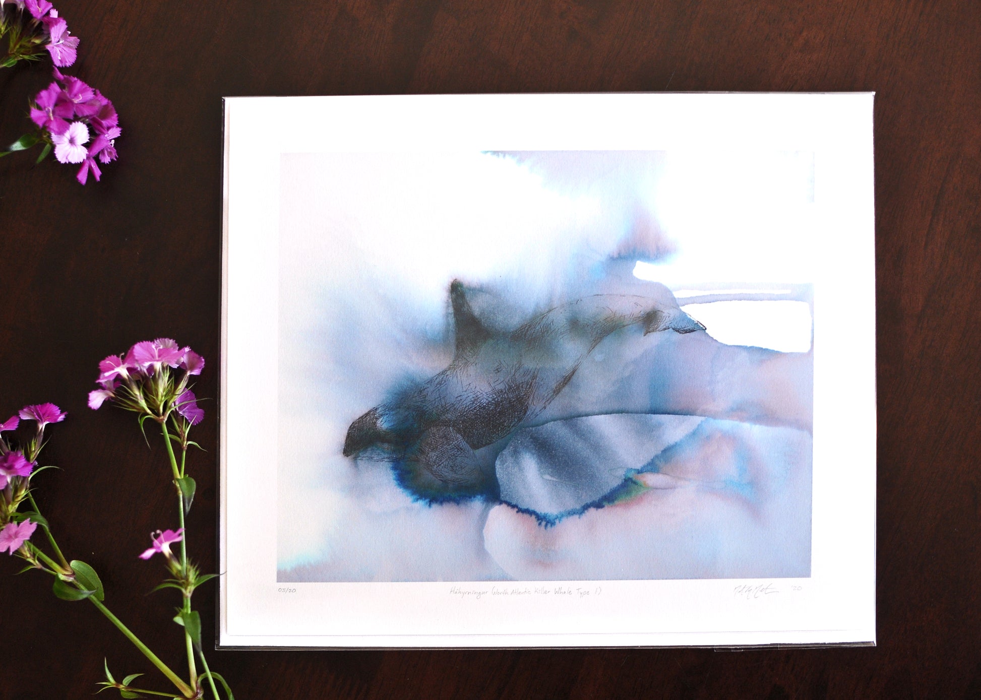 This giclée print, Háhyrningur (North Atlantic Killer Whale Type 1), belongs to a series of drawings I created during an artist residency along the shores of Northern Iceland. The series feature various species of whales from Iceland and are made using pen and ink. As part of my artistic process I allowed natural elements such as freezing winter weather and water from the Denmark Strait to manipulate the drawing. By incorporating these natural forces and elements of nature the drawing teeters between certainty and chance, representation and abstraction. The word "háhyrningur" is Icelandic for orca.