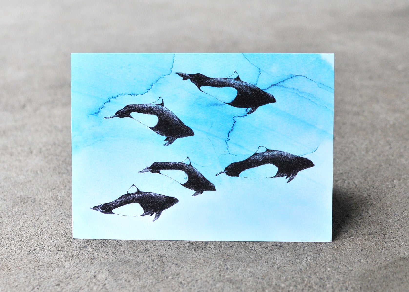 This greeting card features a pod of Dall's Porpoises swimming through the water. Dall's porpoises are incredibly fast—reaching speeds of 55 km/h (34 mi/h)! The appearance of their block-like bodies at the surface has sometimes been said to resemble rotating squares.