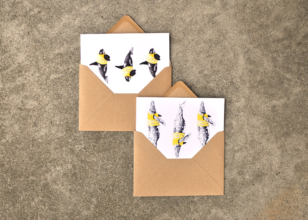 Safety first! This imaginative card features a trio of humpback whales proudly modeling personal floatation devices. The original design was hand-drawn using ink and watercolour on paper. This bright and playful card is sure to bring a smiles wherever it is sent!