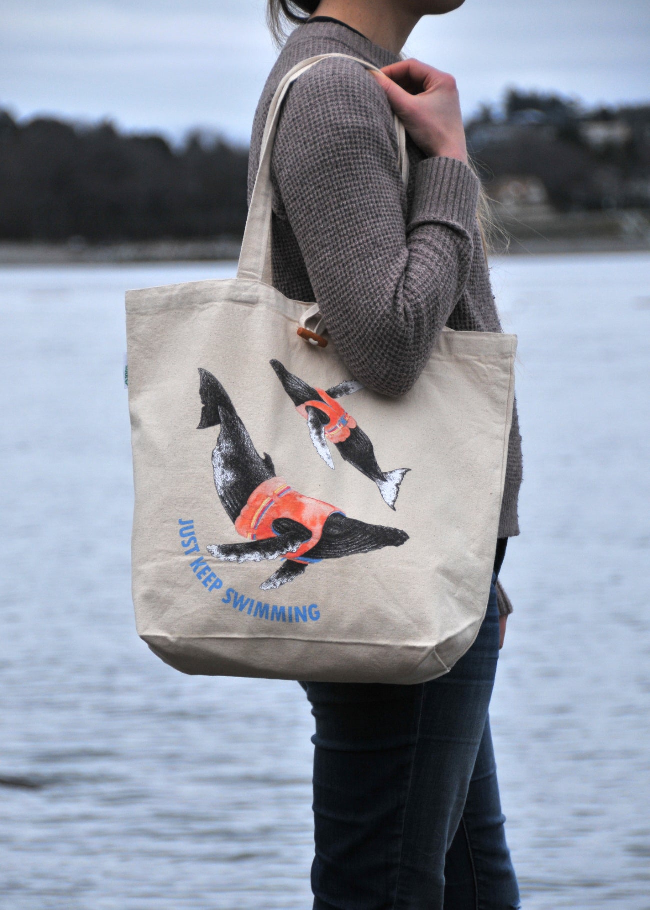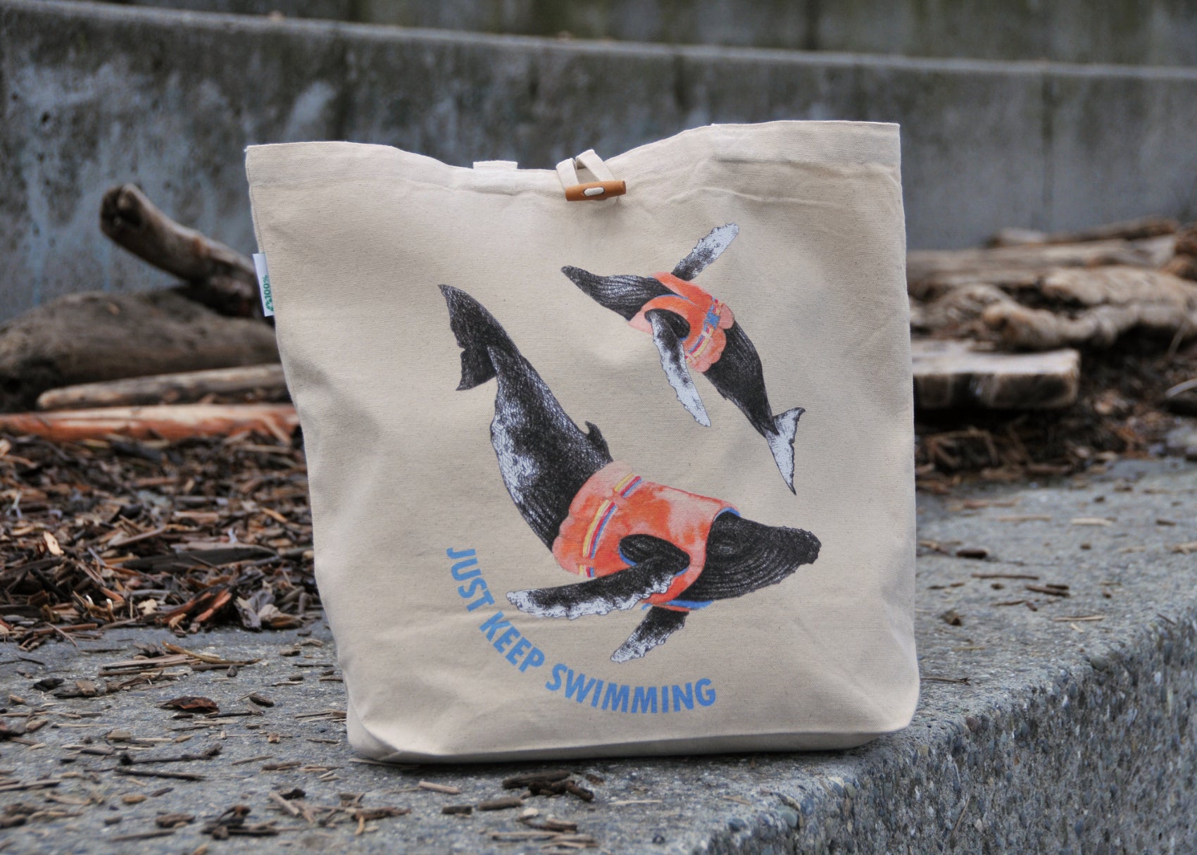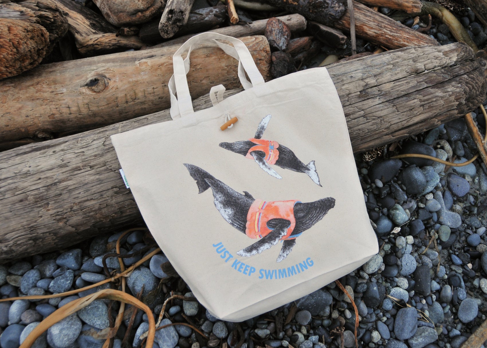 This whimsical tote bag brings together art, humour and a love of being in the water. The image is from my original ink and watercolour drawing that shows two humpback whales swimming and wearing a couple retro life jackets. This bag is the perfect size for heading out to swim club, a study sesh or going to the beach!