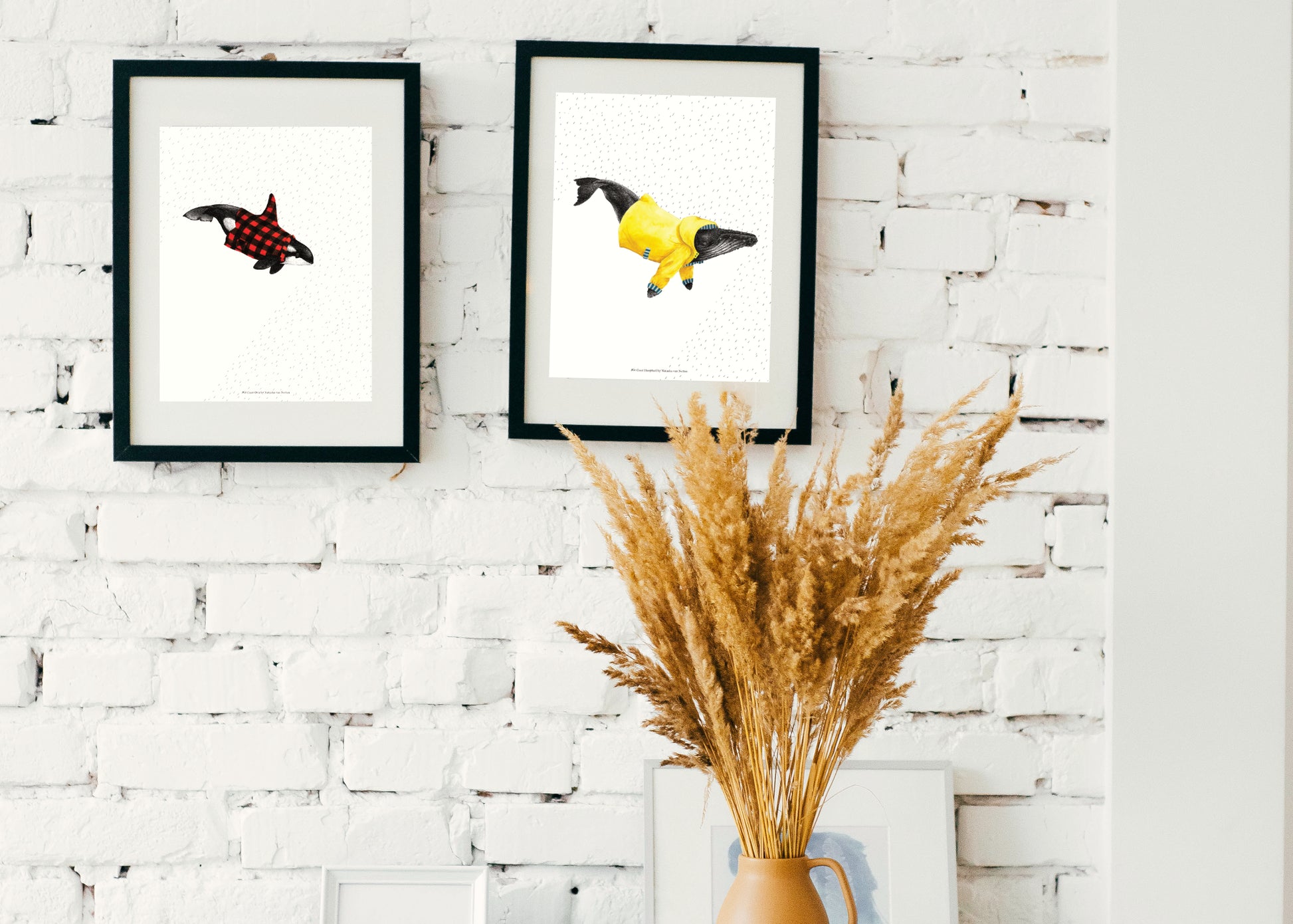 Wet Coast Orca print: Rainy weather is common on the coast... and this whale knows how to dress for it! This unique poster print card features an orca wearing its favourite red and black flannel plaid. This design was originally hand-drawn with ink and watercolour.