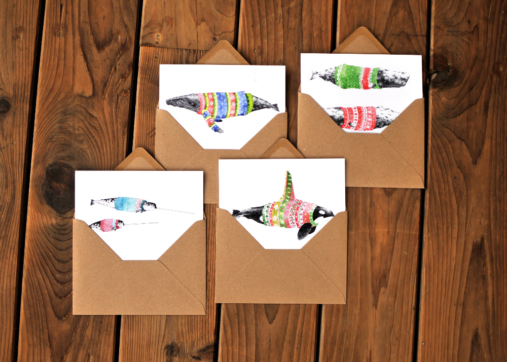 This set of four greeting cards feature a variety of whale species wearing cozy, knit, winter sweaters. The original illustrations were hand drawn using pen and ink and the sweater was painted using watercolour — combining both science and whimsy. These cards are the perfect way to spread some cheer!