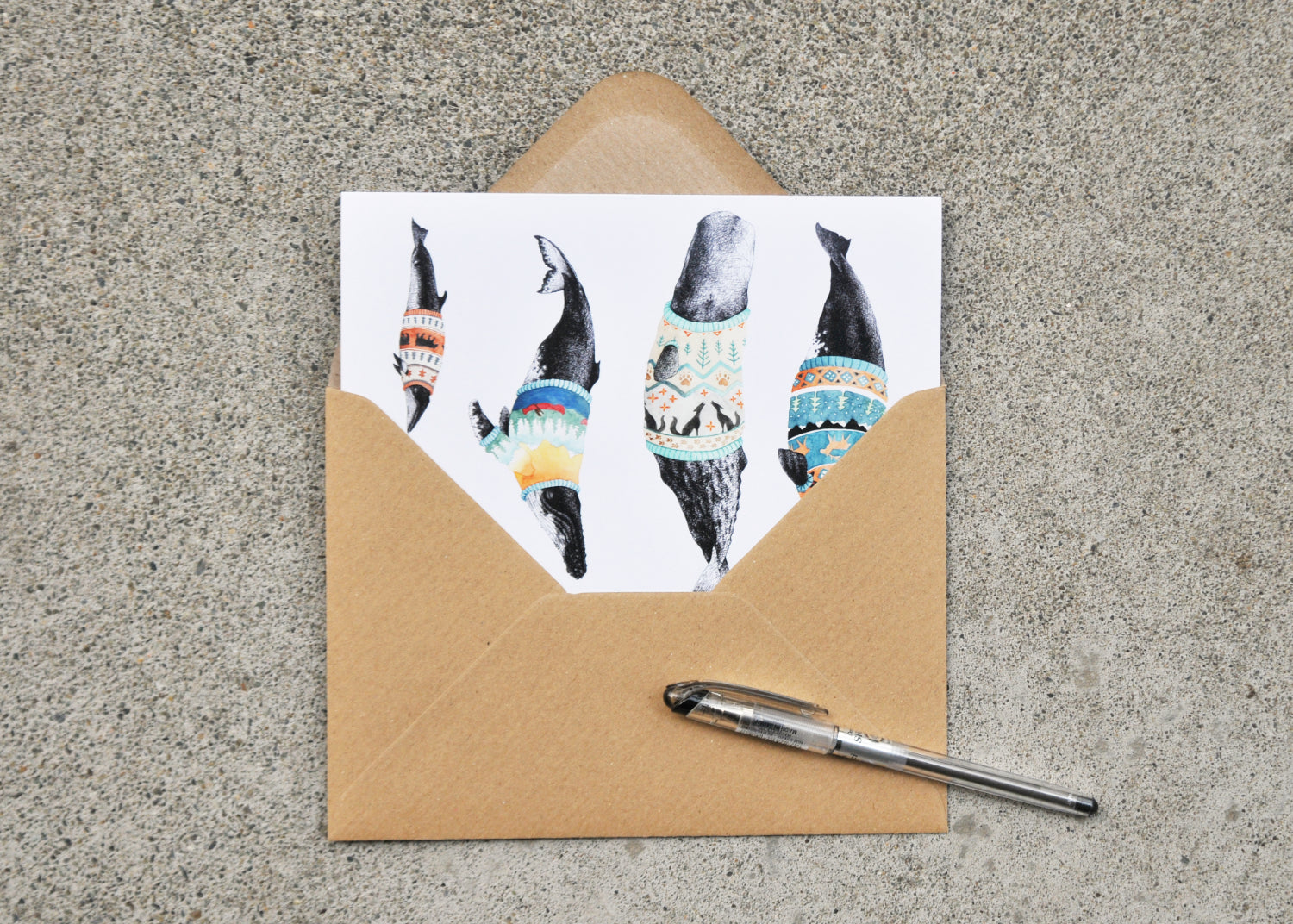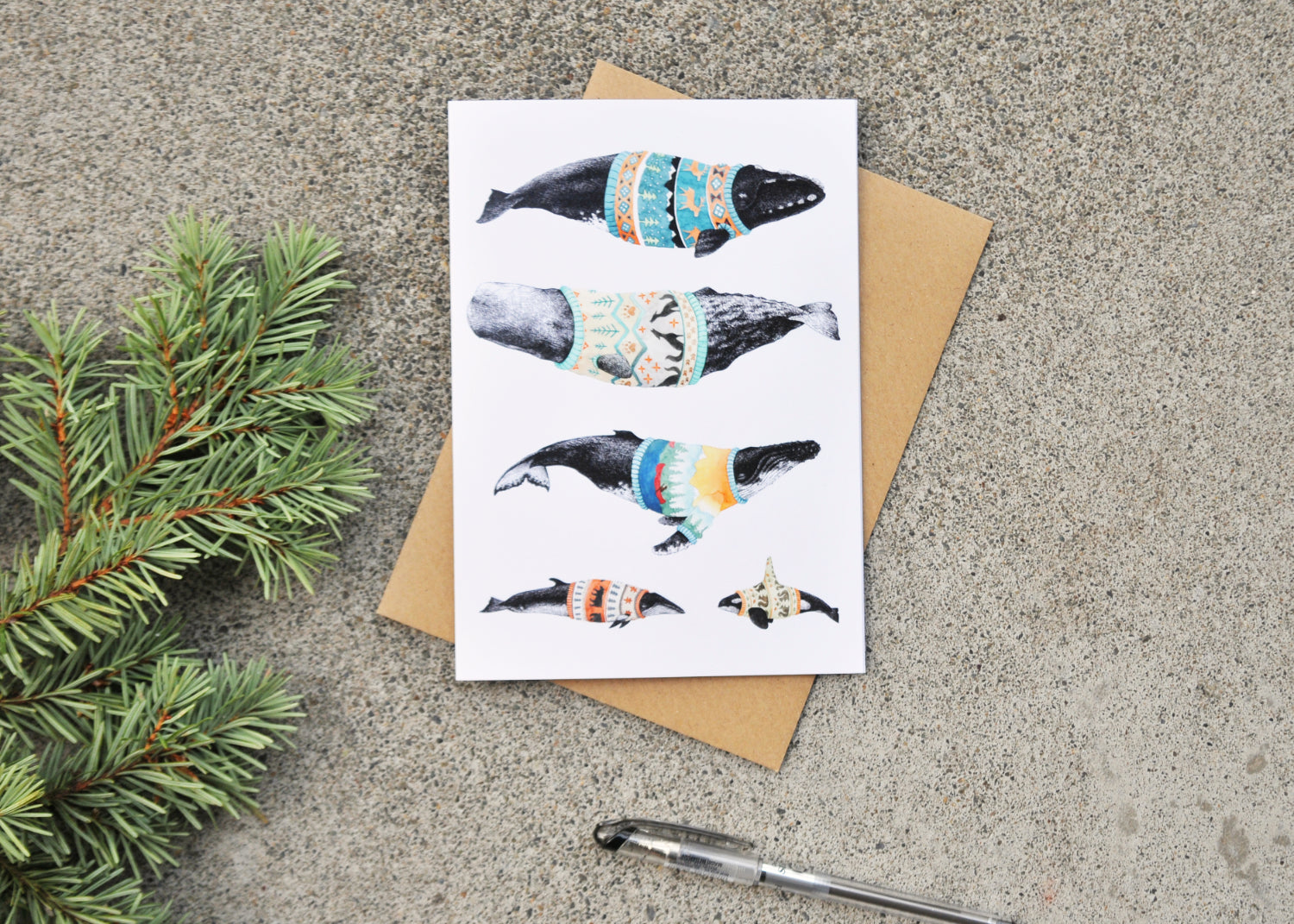 This colourful greeting card features five species of cetaceans: (top to bottom) right whale, sperm whale, humpback whale, minke and an orca. The original drawings used for this card were drawn by hand using ink and watercolour. This card is blank on the inside, perfect for any occasion.