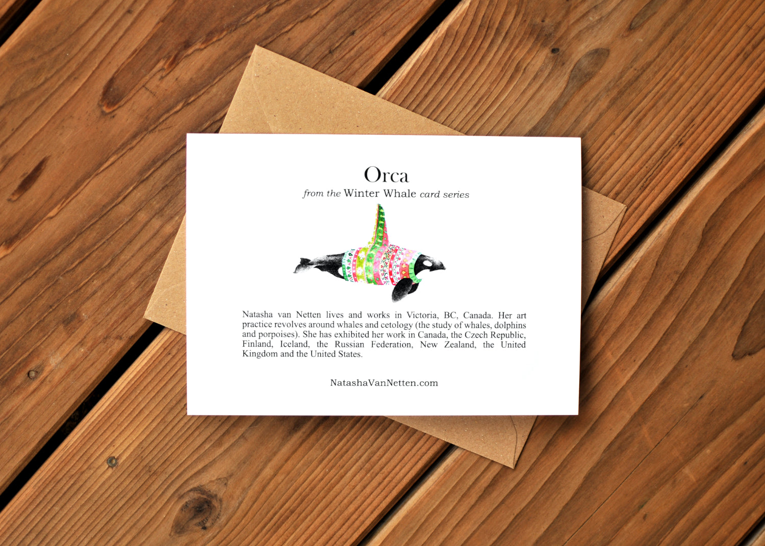 This playful card features an orca wearing a cozy, knit, winter sweater. The original illustration was hand drawn using pen and ink and the sweater was painted using watercolour — combining both science and whimsy. This card is the perfect way to spread some cheer!