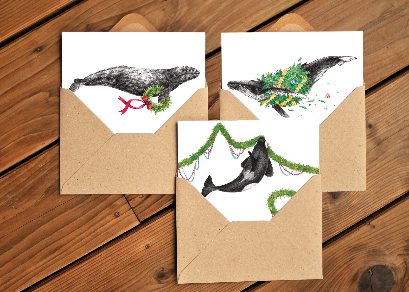 This unique greeting card set features three species of whales decorating with garland, baubles, boughs and wreaths. Inspired by sea creatures that 'decorate' themselves to blend into their surroundings... but with a playful, seasonal twist! The original drawings used for this card set were drawn by hand using ink and watercolour for maximum detail and texture. This card is blank on the inside.