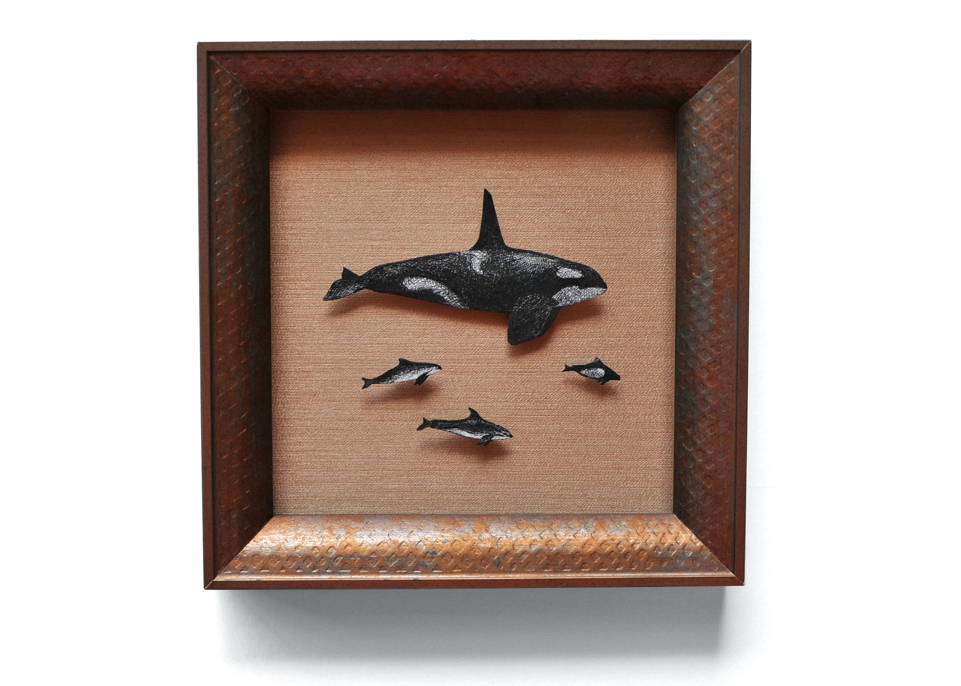 This unique artwork features a collection of dolphins and porpoises that frequent the shores of British Columbia: orca (top), harbour porpoise (left), pacific white-sided dolphin and Dall's porpoise (right). These species were drawn with in a traditional method using ink and a dip pen. The drawings have been mounted in a museum-inspired shadowbox, similar to butterfly specimen boxes. The drawings are proportionally to each other, showing the range of size difference between species.